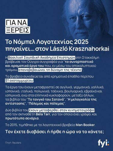 fyi.news.official Από το “Τανγκό του Σατανά” μέχρι τη “Μελαγχολία της Αντίστασης”, ο László Krasznahorkai χτίζει κόσμους που σε καταπίνουν. Φέτος, ο Ούγγρος συγγραφέας τιμάται με το Νόμπελ Λογοτεχνίας 2025 για τη δύναμή... Διάβασε περισσότερα