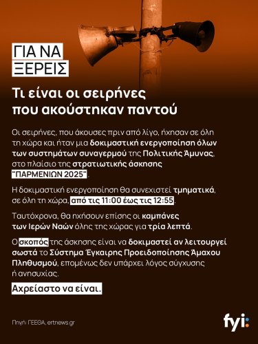 fyi.news.official Μην ανησυχείς, οι σειρήνες που ακούστηκαν σήμερα ήταν μόνο για δοκιμή. Η Ελλάδα τεστάρει τα συστήματα έγκαιρης προειδοποίησης, ώστε να είναι έτοιμα, όταν πραγματικά χρειάζεται.